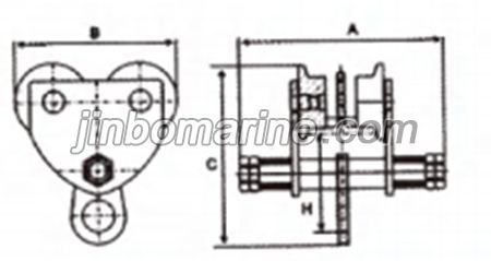 | Model | Capaity(ton) | Proof load (ton) | Minimun revoing radus(mm) | Dimensions(mm) | Fits Beam(mm) | N.W.(kg) | ||||